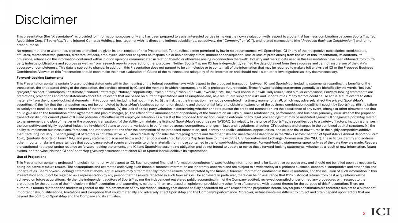 This presentation (the “ Presentation ”) is provided for information purposes only and has been prepared to assist interested parties in making their own evaluatio n w ith respect to a potential business combination between SportsMap Tech Acquisition Corp. (“ SportsMap ”) and Infrared Cameras Holdings, Inc. (together with its direct and indirect subsidiaries, collectively, the “ Company ” or “ ICI ”), and related transactions (the “ Proposed Business Combination ”) and for no other purpose. No representations or warranties, express or implied are given in, or in respect of, this Presentation. To the fullest extent pe rmitted by law in no circumstances will SportsMap, ICI or any of their respective subsidiaries, stockholders, affiliates, representatives, partners, directors, officers, employees, advisers or agents be responsible or liable for any di rec t, indirect or consequential loss or loss of profit arising from the use of this Presentation, its contents, its omissions, reliance on the information contained within it, or on opinions communicated in relation thereto or otherwise aris ing in connection therewith. Industry and market data used in this Presentation have been obtained from third - party industry publications and sources as well as from research reports prepared for other purposes. Neither SportsMap nor I CI has independently verified the data obtained from these sources and cannot assure you of the data’s accuracy or completeness. This data is subject to change. In addition, this Presentation does not purport to be all - inclusive or to contain all of the information that may be required to make a full analysis of ICI or the Proposed Business Combination. Viewers of this Presentation should each make their own evaluation of ICI and of the relevance and adequacy of t he information and should make such other investigations as they deem necessary. Forward - Looking Statements This Presentation contains certain forward - looking statements within the meaning of the federal securities laws with respect to the proposed transaction between ICI and SportsMap, including statements regarding the benefits of the transaction, the anticipated timing of the transaction, the services offered by ICI and the markets in which it operates, and IC I’s projected future results. These forward - looking statements generally are identified by the words “believe,” “project,” “expect,” “anticipate,” “estimate,” “intend,” “strategy,” “future,” “opportunity,” “plan,” “may,” “should,” “will, ” “ would,” “will be,” “will continue,” “will likely result,” and similar expressions. Forward - looking statements are predictions, projections and other statements about future events that are based on current expectations and assumptions and, as a result, are subject to risks and uncertainties. Many factors could cause actual future events to differ materially from the forward - looking statements in this document, including but not limited to: ( i ) the risk that the transaction may not be completed in a timely manner or at all, which may adversely affect the price of Sp ort sMap’s securities, (ii) the risk that the transaction may not be completed by SportsMap’s business combination deadline and the pote nti al failure to obtain an extension of the business combination deadline if sought by SportsMap, (iii) the failure to satisfy the conditions to the consummation of the transaction, (iv) the lack of a third party valuation in determining whe the r or not to pursue the proposed transaction, (v) the occurrence of any event, change or other circumstance that could give rise to the termination of the agreement and plan of merger, (vi) the effect of the announcement or pendency of th e t ransaction on ICI’s business relationships, performance, and business generally, (vii) risks that the proposed transaction disrupts current plans of ICI and potential difficulties in ICI employee retention as a result of the proposed tr ans action, (viii) the outcome of any legal proceedings that may be instituted against ICI or against SportsMap related to the agreement and plan of merger or the proposed transaction, (ix) the ability to maintain the listing of SportsMap’s secu rit ies on NASDAQ, (x) volatility in the price of SportsMap’s securities due to a variety of factors, including changes in the competitive and highly regulated industries in which ICI plans to operate, variations in performance across competitors, cha nges in laws and regulations affecting ICI’s business and changes in the combined capital structure, (xi) the ability to implement business plans, forecasts, and other expectations after the completion of the proposed transaction, and ide ntify and realize additional opportunities, and (xii) the risk of downturns in the highly competitive additive manufacturing industry. The foregoing list of factors is not exhaustive. You should carefully consider the foregoing factors and the other risks and uncertainties described in the “Risk Factors” section of SportsMap’s Annual Report on Form 10 - K, Quarterly Reports on Form 10 - Q, and proxy statement discussed below and other documents filed by SportsMap from time to ti me with the U.S. Securities and Exchange Commission (the “SEC”). These filings identify and address other important risks and uncertainties that could cause actual events and results to differ materially from those contained in the forward - looking statements. Forward - looking statements speak only as of the date they are made. Readers are cautioned not to put undue reliance on forward - looking statements, and ICI and SportsMap assume no obligation and do not int end to update or revise these forward - looking statements, whether as a result of new information, future events, or otherwise. Neither ICI nor SportsMap gives any assurance that either ICI or SportsMap will achieve its exp