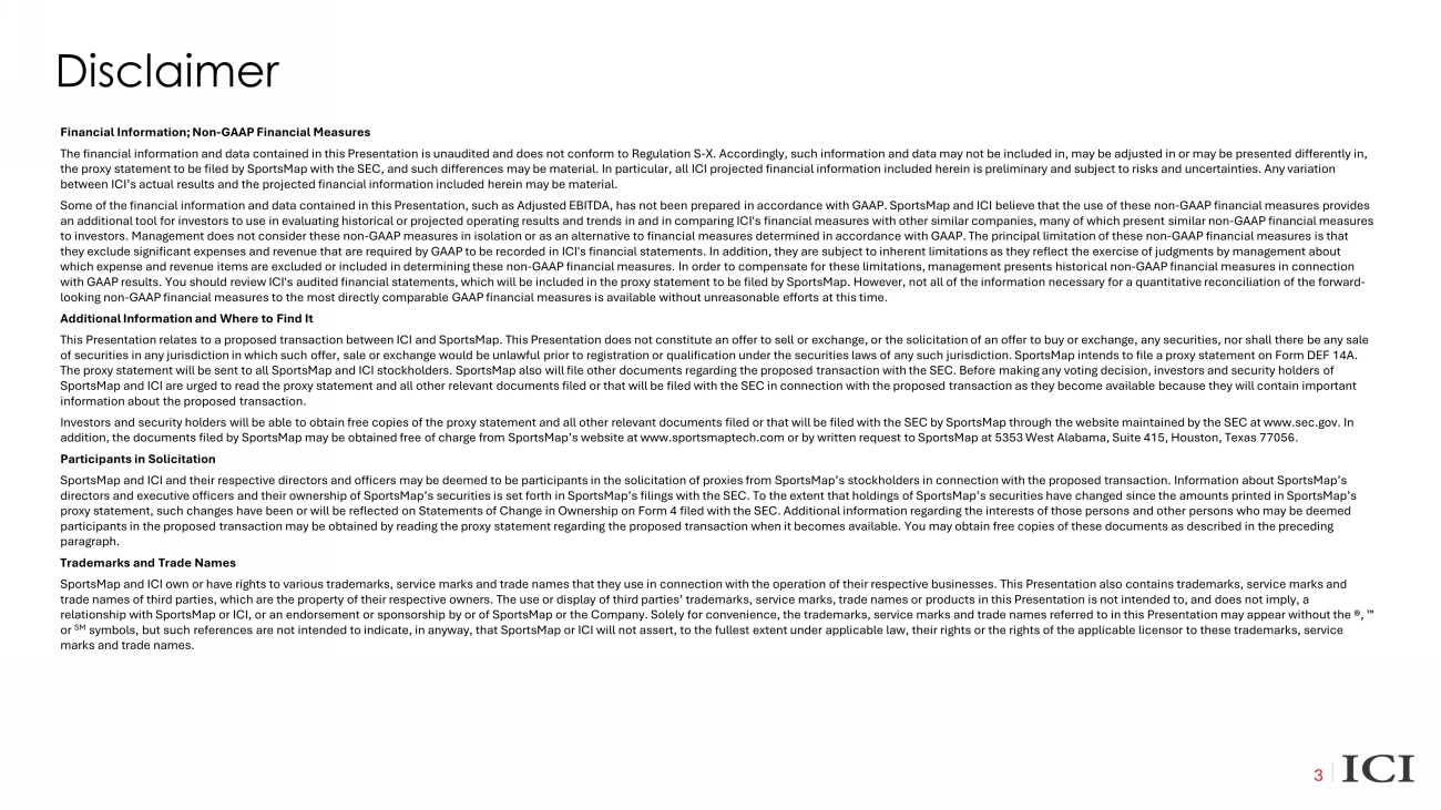 Financial Information; Non - GAAP Financial Measures The financial information and data contained in this Presentation is unaudited and does not conform to Regulation S - X. According ly, such information and data may not be included in, may be adjusted in or may be presented differently in, the proxy statement to be filed by SportsMap with the SEC, and such differences may be material. In particular, all ICI proje cte d financial information included herein is preliminary and subject to risks and uncertainties. Any variation between ICI’s actual results and the projected financial information included herein may be material. Some of the financial information and data contained in this Presentation, such as Adjusted EBITDA, has not been prepared in acc ordance with GAAP. SportsMap and ICI believe that the use of these non - GAAP financial measures provides an additional tool for investors to use in evaluating historical or projected operating results and trends in and in comparin g I CI's financial measures with other similar companies, many of which present similar non - GAAP financial measures to investors. Management does not consider these non - GAAP measures in isolation or as an alternative to financial measures deter mined in accordance with GAAP. The principal limitation of these non - GAAP financial measures is that they exclude significant expenses and revenue that are required by GAAP to be recorded in ICI's financial statements. In addi tio n, they are subject to inherent limitations as they reflect the exercise of judgments by management about which expense and revenue items are excluded or included in determining these non - GAAP financial measures. In order to compensat e for these limitations, management presents historical non - GAAP financial measures in connection with GAAP results. You should review ICI's audited financial statements, which will be included in the proxy statement to be fil ed by SportsMap. However, not all of the information necessary for a quantitative reconciliation of the forward - looking non - GAAP financial measures to the most directly comparable GAAP financial measures is available without unreasonable ef forts at this time. Additional Information and Where to Find It This Presentation relates to a proposed transaction between ICI and SportsMap. This Presentation does not constitute an offer to sell or exchange, or the solicitation of an offer to buy or exchange, any securities, nor shall there be any sale of securities in any jurisdiction in which such offer, sale or exchange would be unlawful prior to registration or qualificat ion under the securities laws of any such jurisdiction. SportsMap intends to file a proxy statement on Form DEF 14A. The proxy statement will be sent to all SportsMap and ICI stockholders. SportsMap also will file other documents regarding th e p roposed transaction with the SEC. Before making any voting decision, investors and security holders of SportsMap and ICI are urged to read the proxy statement and all other relevant documents filed or that will be filed with the SE C in connection with the proposed transaction as they become available because they will contain important information about the proposed transaction. Investors and security holders will be able to obtain free copies of the proxy statement and all other relevant documents fil ed or that will be filed with the SEC by SportsMap through the website maintained by the SEC at www.sec.gov. In addition, the documents filed by SportsMap may be obtained free of charge from SportsMap’s website at www.sportsmaptech.com o r b y written request to SportsMap at 5353 West Alabama, Suite 415, Houston, Texas 77056. Participants in Solicitation SportsMap and ICI and their respective directors and officers may be deemed to be participants in the solicitation of proxies fr om SportsMap’s stockholders in connection with the proposed transaction. Information about SportsMap’s directors and executive officers and their ownership of SportsMap’s securities is set forth in SportsMap’s filings with the S EC. To the extent that holdings of SportsMap’s securities have changed since the amounts printed in SportsMap’s proxy statement, such changes have been or will be reflected on Statements of Change in Ownership on Form 4 filed with the SE C. Additional information regarding the interests of those persons and other persons who may be deemed participants in the proposed transaction may be obtained by reading the proxy statement regarding the proposed transaction wh en it becomes available. You may obtain free copies of these documents as described in the preceding paragraph. Trademarks and Trade Names SportsMap and ICI own or have rights to various trademarks, service marks and trade names that they use in connection with th e o peration of their respective businesses. This Presentation also contains trademarks, service marks and trade names of third parties, which are the property of their respective owners. The use or display of third parties’ tradema rks , service marks, trade names or products in this Presentation is not intended to, and does not imply, a relationship with SportsMap or ICI, or an endorsement or sponsorship by or of SportsMap or the Company. Solely for convenienc e, the trademarks, service marks and trade names referred to in this Presentation may appear without the ®, ¯ or SM symbols, but such references are not intended to indicate, in anyway, that SportsMap or ICI will not assert, to the fullest e xt ent under applicable law, their rights or the rights of the applicable licensor to these trademarks, service marks and trade names. Disclaimer 3