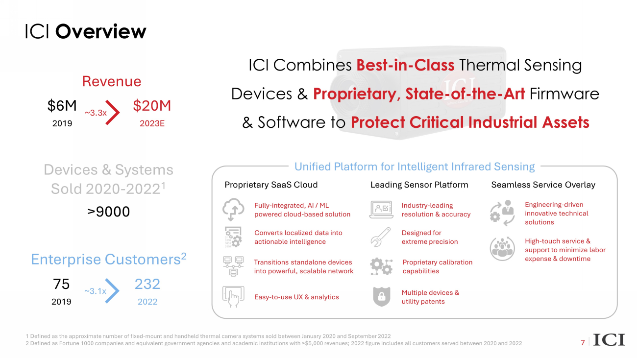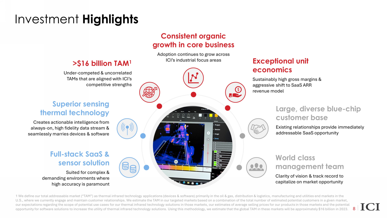 ICI Overview 7 ICI Combines Best - in - Class Thermal Sensing Devices & Proprietary, State - of - the - Art Firmware & Software to Protect Critical Industrial Assets Fully - integrated, AI / ML powered cloud - based solution Converts localized data into actionable intelligence Transitions standalone devices into powerful, scalable network Easy - to - use UX & analytics Proprietary SaaS Cloud Multiple devices & utility patents Industry - leading resolution & accuracy Designed for extreme precision Proprietary calibration capabilities Leading Sensor Platform Engineering - driven innovative technical solutions High - touch service & support to minimize labor expense & downtime Seamless Service Overlay Unified Platform for Intelligent Infrared Sensing Revenue $6M 2019 $20M 2023E ~3.3x Enterprise Customers 2 75 2019 232 2022 ~3.1x 1 Defined as the approximate number of fixed - mount and handheld thermal camera systems sold between January 2020 and September 2 022 2 Defined as Fortune 1000 companies and equivalent government agencies and academic institutions with >$5,000 revenues; 2022 fig ure includes all customers served between 2020 and 2022 Devices & Systems Sold 2020 - 2022 1 >9000
