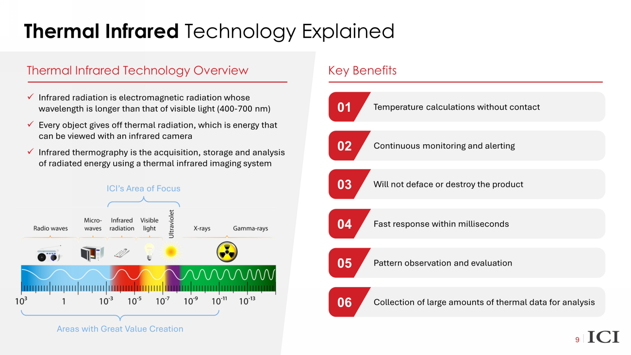Thermal Infrared Technology Explained 9 x Infrared radiation is electromagnetic radiation whose wavelength is longer than that of visible light (400 - 700 nm) x Every object gives off thermal radiation, which is energy that can be viewed with an infrared camera x Infrared thermography is the acquisition, storage and analysis of radiated energy using a thermal infrared imaging system Thermal Infrared Technology Overview Key Benefits ICI’s Area of Focus Areas with Great Value Creation Collection of large amounts of thermal data for analysis Continuous monitoring and alerting Will not deface or destroy the product Fast response within milliseconds Pattern observation and evaluation 06 05 04 03 02 Temperature calculations without contact 01