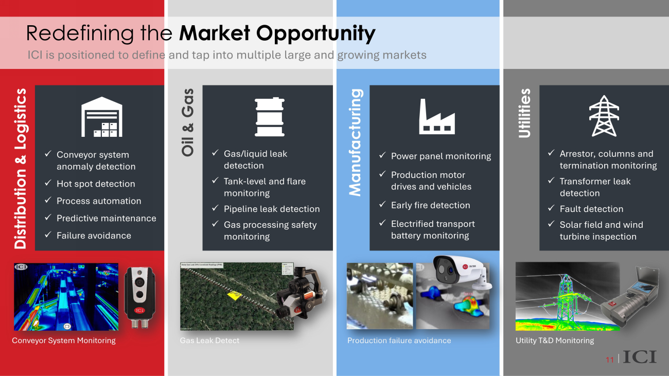 11 Redefining the Market Opportunity ICI is positioned to define and tap into multiple large and growing markets Distribution & Logistics x Conveyor system anomaly detection x Hot spot detection x Process automation x Predictive maintenance x Failure avoidance Oil & Gas Manufacturing Utilities x Gas/liquid leak detection x Tank - level and flare monitoring x Pipeline leak detection x Gas processing safety monitoring x Power panel monitoring x Production motor drives and vehicles x Early fire detection x Electrified transport battery monitoring x Arrestor, columns and termination monitoring x Transformer leak detection x Fault detection x Solar field and wind turbine inspection Conveyor System Monitoring Gas Leak Detect Utility T&D Monitoring Production failure avoidance