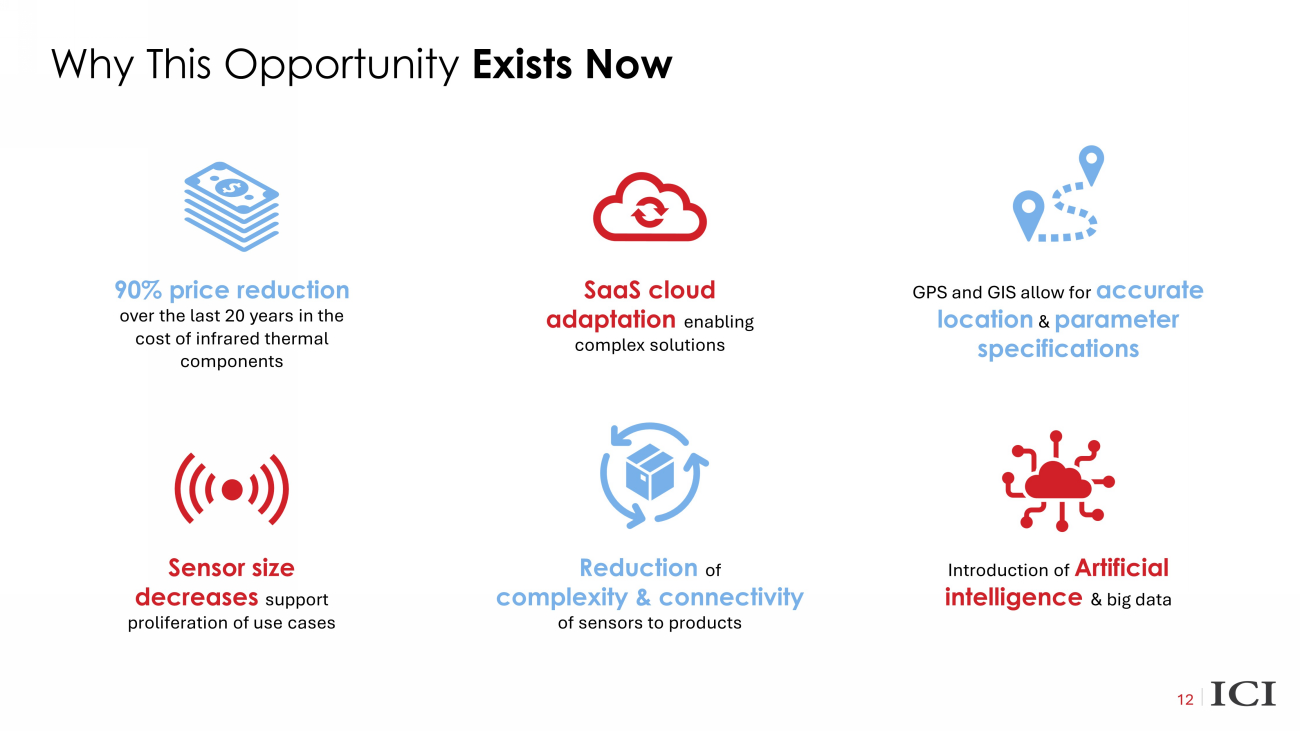 Why This Opportunity Exists Now 12 90% price reduction over the last 20 years in the cost of infrared thermal components Sensor size decreases support proliferation of use cases SaaS cloud adaptation enabling complex solutions Introduction of Artificial intelligence & big data Reduction of complexity & connectivity of sensors to products GPS and GIS allow for accurate location & parameter specifications