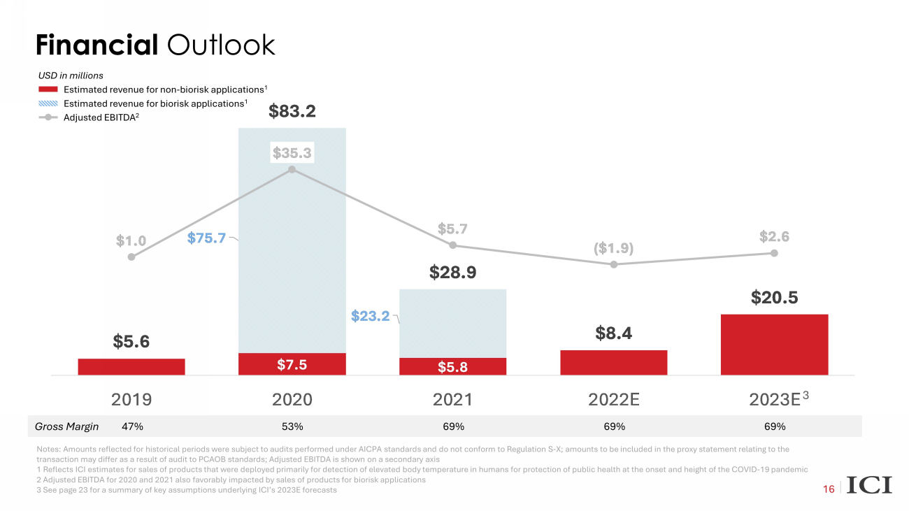 Financial Outlook 16 Gross Margin 47% 53% 69% 69% 69% Notes: Amounts reflected for historical periods were subject to audits performed under AICPA standards and do not conform to Reg ulation S - X; amounts to be included in the proxy statement relating to the transaction may differ as a result of audit to PCAOB standards; Adjusted EBITDA is shown on a secondary axis 1 Reflects ICI estimates for sales of products that were deployed primarily for detection of elevated body temperature in hum ans for protection of public health at the onset and height of the COVID - 19 pandemic 2 Adjusted EBITDA for 2020 and 2021 also favorably impacted by sales of products for biorisk applications 3 See page 23 for a summary of key assumptions underlying ICI’s 2023E forecasts $7.5 $5.8 $75.7 $23.2 $5.6 $83.2 $28.9 $8.4 $20.5 $1.0 $35.3 $5.7 ($1.9) $2.6 2019 2020 2021 2022E 2023E 3 Estimated revenue for non - biorisk applications 1 Estimated revenue for biorisk applications 1 USD in millions Adjusted EBITDA 2