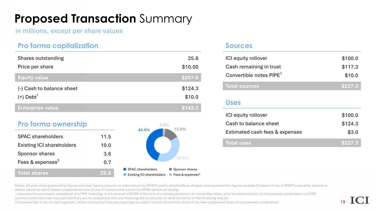 Pro forma capitalization Shares outstanding 25.8 Price per share $10.00 Equity value $257.6 ( - ) Cash to balance sheet $124.3 (+) Debt 1 $10.0 Enterprise value $143.3 Pro forma ownership SPAC shareholders 11.5 Existing ICI shareholders 10.0 Sponsor shares 3.6 Fees & expenses 2 0.7 Total shares 25.8 Proposed Transaction Summary 19 Sources ICI equity rollover $100.0 Cash remaining in trust $117.3 Convertible notes PIPE 1 $10.0 Total sources $227.3 in millions, except per share values Uses ICI equity rollover $100.0 Cash to balance sheet $124.3 Estimated cash fees & expenses $3.0 Total uses $227.3 2.8% 13.8% 38.8% 44.6% Existing ICI shareholders SPAC shareholders Sponsor shares Fees & expenses 2 Notes: All post - closing ownership figures and cash figures assume no redemptions by SMAP's public stockholders; all post - closing ownership figures exclude ( i ) impact of any of SMAP's warrants, earnout or shares issued as stock - based compensation and (ii) any ICI options that convert to SMAP options at closing 1 Assumes the successful completion of a PIPE financing, in the amount of $10M in the form of a private placement of converti ble notes, prior to consummation of the business combination; no PIPE commitments have been secured and there are no assurances that any financing will be secured, or what the terms of that finan cin g may be 2 Assumes that in lieu of cash payment, certain transaction fees and expenses are paid in shares of common stock of the new c omp any at close of the business combination