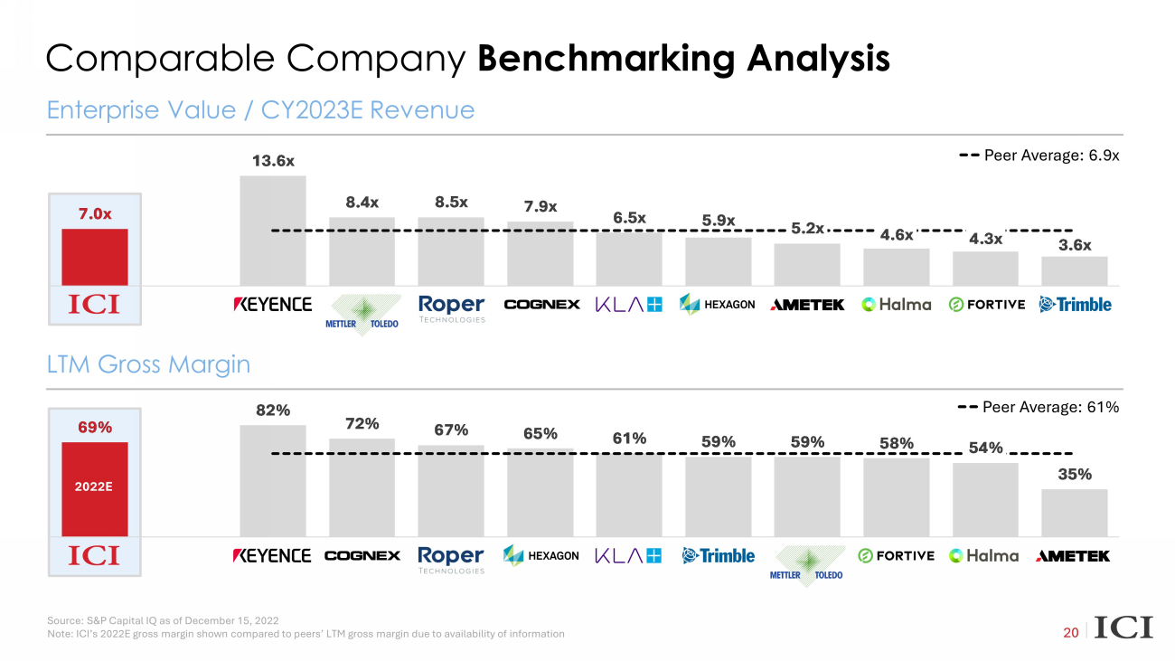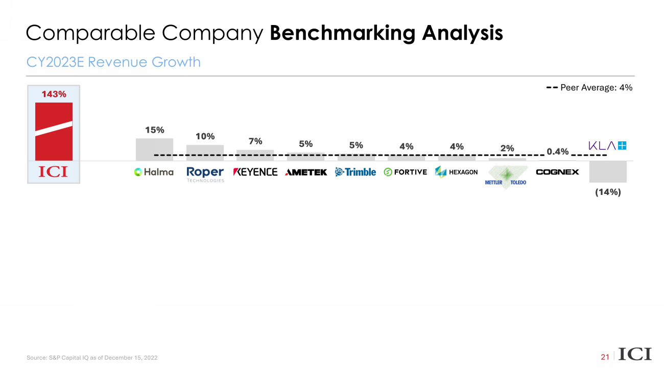 69% 82% 72% 67% 65% 61% 59% 59% 58% 54% 35% 2022E Comparable Company Benchmarking Analysis 20 Source: S&P Capital IQ as of December 15, 2022 Note: ICI’s 2022E gross margin shown compared to peers’ LTM gross margin due to availability of information Enterprise Value / CY2023E Revenue LTM Gross Margin 7.0x 13.6x 8.4x 8.5x 7.9x 6.5x 5.9x 5.2x 4.6x 4.3x 3.6x Peer Average: 6.9x Peer Average: 61%