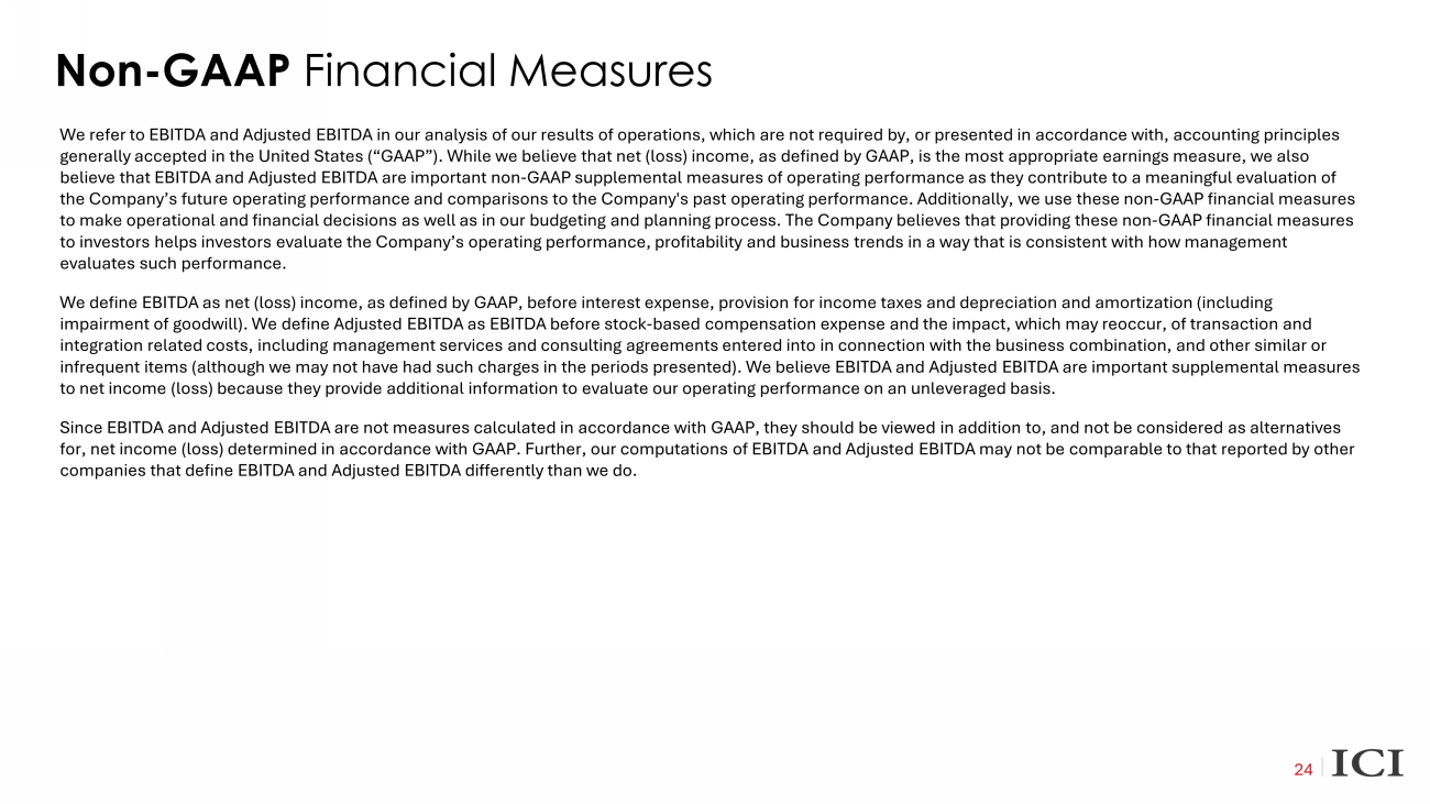 Non - GAAP Financial Measures 24 We refer to EBITDA and Adjusted EBITDA in our analysis of our results of operations, which are not required by, or presented in accordance with, accounting principles generally accepted in the United States (“GAAP”). While we believe that net (loss) income, as defined by GAAP, is the most ap pro priate earnings measure, we also believe that EBITDA and Adjusted EBITDA are important non - GAAP supplemental measures of operating performance as they contribute to a meaningful evaluation of the Company’s future operating performance and comparisons to the Company's past operating performance. Additionally, we use the se non - GAAP financial measures to make operational and financial decisions as well as in our budgeting and planning process. The Company believes that provi din g these non - GAAP financial measures to investors helps investors evaluate the Company’s operating performance, profitability and business trends in a way that is co nsistent with how management evaluates such performance. We define EBITDA as net (loss) income, as defined by GAAP, before interest expense, provision for income taxes and depreciati on and amortization (including impairment of goodwill). We define Adjusted EBITDA as EBITDA before stock - based compensation expense and the impact, which may r eoccur, of transaction and integration related costs, including management services and consulting agreements entered into in connection with the busine ss combination, and other similar or infrequent items (although we may not have had such charges in the periods presented). We believe EBITDA and Adjusted EBITDA are important supplemental measures to net income (loss) because they provide additional information to evaluate our operating performance on an unleveraged basi s. Since EBITDA and Adjusted EBITDA are not measures calculated in accordance with GAAP, they should be viewed in addition to, a nd not be considered as alternatives for, net income (loss) determined in accordance with GAAP. Further, our computations of EBITDA and Adjusted EBITDA may not be co mparable to that reported by other companies that define EBITDA and Adjusted EBITDA differently than we do.